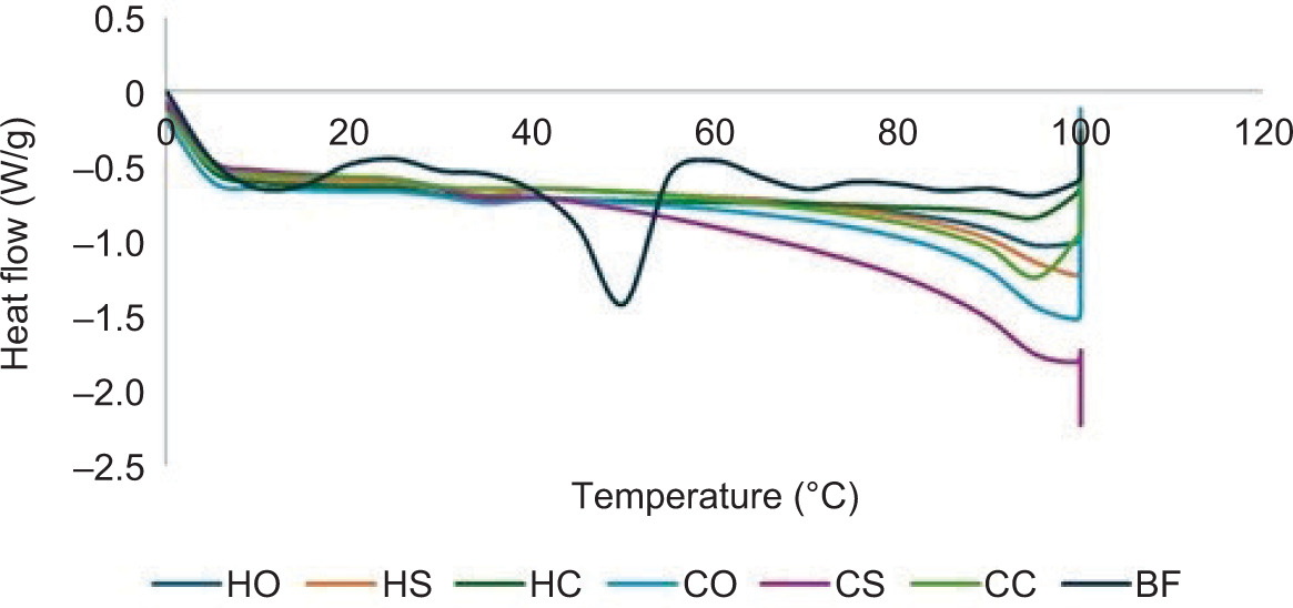 Figure 2. Differential scanning calorimetry (DSC) curve of emulsion gel prepared from different oil types (olive oil, sunflower oil, and canola oil) using different gelation techniques (hot and cold gelation techniques). HO: hot gelation-olive oil; HS: hot gelation-sunflower oil; HC: hot gelation-canola oil; CO: cold gelation-olive oil; CS: cold gelation-sunflower oil; CC: cold -gelation-canola oil; BF: beef fat.