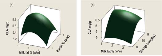 Figure 1. Surface plot of interactive effect on CLA production in yogurt by P. freudenreichii ssp. shermanii. (a) Effect of inulin and milk fat percentage; (b) effect of storage time of yogurt at 4°C and milk fat percentage.