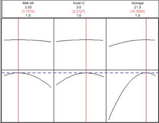 Figure 1b shows that at a constant MFP, production of CLA in yogurts increased with increasing storage time at 4°C. Increase in the concentration of CLA continued until day 16 of storage of yogurt at 4°C, and then concentration of CLA decreased mildly. Studies have been conducted on the effects of yogurt storage time at 4°C on CLA production by different probiotics with various results. The results obtained by Boylston and Beitz (2002) indicated no significant change in yogurts’ CLA content during storage for 7 days. In another study, Shantha et al. (1995) also showed stability in yogurts’ c9t11-CLA isomer concentration at refrigerated storage for 42 days. In a study done by Akalin et al. (2007), relative decrease was reported in the concentration of c9t11-CLA isomer after 28 days. The major reason for decrease in yogurts’ CLA concentration at storage time included oxidative reactions that caused destruction of conjugated double bond system. Figure 2 points the best conditions for the production of CLA in yogurts by P. freudenreichii ssp. shermanii. The best values for the three variables of MFP (X1), inulin concentration (X2) and storage time at 4°C (X3) included 1.75% (w/w), 2.27% (w/v) and 17 days, respectively; the highest CLA production by P. freudenreichii ssp. shermanii was seen in yogurts containing inulin (X2).