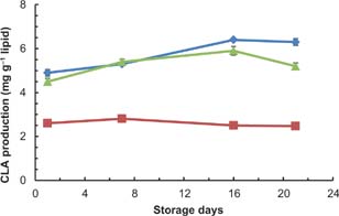 Figure 3. CLA production during storage of yogurt samples at 4°C. Yogurts: YC (■), YC + PS4 (▲), YC + PS4 + inulin (◆).