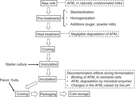 Figure 1. General processing flow chart of fermented milk and relevant steps regarding the aflatoxin M1 (AFM1) contamination during manufacture (in italic).