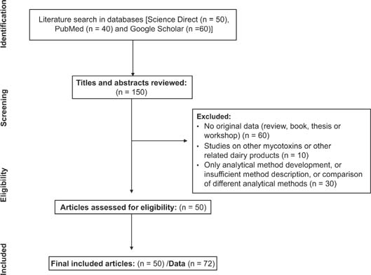 After excluding unsuitable articles due to irrelevant content, 150 full texts of potentially eligible articles were downloaded. Then, the downloaded citations were examined for inclusion and criteria of final eligibility. Inclusion criteria were: (1) availability of full-text article, (2) original cross-sectional research studies (not reviews), (3) reporting of AFM1 prevalence among fermented, milk-based products, (4) indicating an accurate analytical method, and (5) published in the English in order to avoid any mistake during translation from other languages. The citations that did not meet these criteria were excluded. A total of 100 articles were excluded based on the abovementioned exclusion criteria according to PRISMA, as detailed in Figure 2. Finally, 50 articles that fulfilled the inclusion criteria were included in this review.