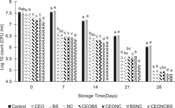 Table 2 showed the results of sensory characteristics (flavor, texture, and general acceptance) during 28 days of storage time. The interaction between group and time on sensory characteristics was significant (P<0.05). The sensory scores of examples decreased during storage time. A more severe drop in sensory score was observed for stress treatments except for the CEO (P<0.05). Flavor scores for all treatments showed there were no significant differences among all samples on the first day of storage (P>0.05). The most leading and lowest scores were attributed to control (4±0) and CEONCBS (3.11±0.33) at 28 days of storage time, respectively (P<0.05). The texture feature results showed no significant difference within samples on the first day of storage (P>0.05). The highest and lowest scores were attributed to control (4.33±0.50) and CEONCBS (3.22±0.44) at 28 days of storage time, respectively (P < 0.05). Overall acceptance of samples indicated no significant difference among all samples on the first day of storage (P > 0.05). The highest and lowest scores were attributed to control (4±0) and CEONCBS (3.220 ± 0.44) at 28 days of storage time, respectively (P < 0.05).