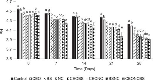 Figure 2. Effect of Cuminum cyminum essential oil (CEO), NaCl (NC), bile salts (BS), and their combinations on changes in pH of probiotic yogurt. Deviation bars designate the standard error of the method (n = 3).