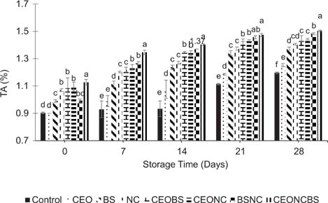 The titratable acidity (Figure 3) results showed that interaction between group and time was significant (P<0.05). The acidity of all samples significantly increased during storage time (P<0.05). The acidity of the control sample was less than those of stress treatments (P<0.05). Treatments CEO and CEONCBS had the highest and lowest acidity, respectively (P<0.05). After 28 days of the storage time, the lowest and highest acidity values were related to treatments under the stress of CEONCBS (1.19±0.008) and control (1.50±0.006), respectively. No significant difference was observed between NC and BC treatment during 28 days of storage (P>0.05).
