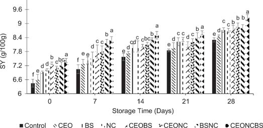 Results showed that exchange within-group and time was notable (P<0.05). As shown in Figure 4, the amount of syneresis significantly rose in all samples during storage time (P<0.05). The increase in intensity for control and CEO treatments was less than that for stress treatments (P<0.05). Among the stressful treatments, the treatments under stress with CEO and CEONCBS had the lowest and highest percentage of syneresis, respectively, during 28 days of storage (P<0.05). No significant difference was observed between treatments with NC and BC on the same day of storage time (P>0.05). After 28 days of storage time, the lowest and the highest percentages of syneresis were observed for control (8.30±0.09) and stress with CEONCBS (9.25±0.13) treatments, respectively.