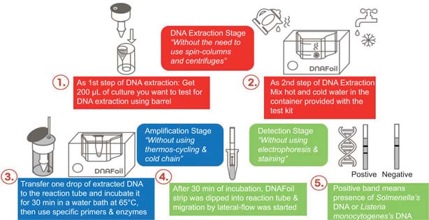 DNAFoil mechanism is depicted in Figure 1. Steps 1 and 2 show the DNA extraction, lysing, neutralizing, and stabilizing processes of 200 μL of culture using a barrel without the need to use spin-columns and centrifuges. Briefly, bacteria cells are broken by an alkaline solution that contains chaotropic salts. This allows DNA to be released in the solution. The alkaline pH of the solution is not compatible with downstream DNA amplification; therefore, a neutralization/stabilization step is added, and it consists of buffering the pH with a second solution, which also provides monovalent salts that facilitate the DNA amplification reaction. Amplification stage of DNA target is started via step 3; one drop of extracted DNA is transferred to the reaction tube and is incubated in a water bath at 65°C. Then, using the specific primers and enzymes, the DNA targets will amplify and make multiple copies without using thermos-cycling and cold chain.