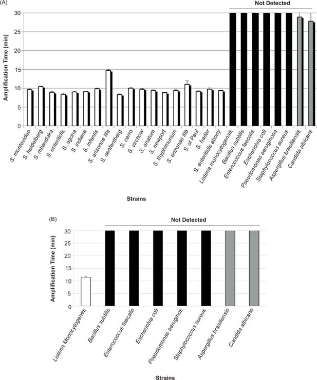 Figure 2. Amplification time—selectivity experiment. (A) Different cultures of Salmonella (in white), non-Salmonella bacteria (in black), and fungus (in gray) were prepared at an independent microbiology lab. (B) Listeria monocytogenes(in white), different bacterial cultures (in black), and fungus (in gray) were prepared at an independent microbiology lab. Broth media (200 μL) was withdrawn from cultures containing 108 CFU/mL. Bacteria were lysed according to the standard DNAFoil method. DNA detection was performed with a real-time assay according to the Swiss Decode protocol. Data represent mean ± SD, n = 3.