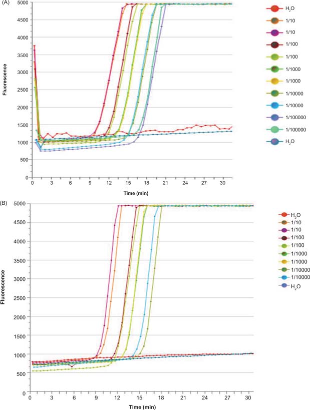Figure 3. Amplification time-sensitivity experiment. Ten times serial dilution of crude DNA extracts from Salmonella enterica and Listeria monocytogenes were diluted in 10 mM TRIS pH 8.0 or DNAFoil lysis buffer. One microliter of the lysis solution was taken to run a real-time assay. (A) We can observe that the time needed for the detection of Salmonella increases as the amount of DNA present in the sample decreases. However, the detection time is well below the 30 min used as our standard amplification time. (B) We can observe that the time needed for the detection of Listeria monocytogenes increases as the amount of DNA present in the sample decreases. However, the detection time is well below the 30 min used as our standard amplification time.