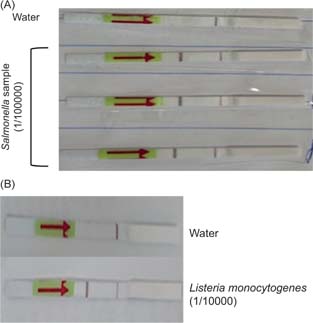 Figure 4. Strips results. (A) Amplified samples from Salmonella dilution 1/100,000 were applied on DNAFoil strips (triplicate). A few minutes later, we could see bands appearing. The band on the left confirmed the presence of Salmonella, whereas the band on the right is the positive control of the strips. (B) Amplified samples from Listeria monocytogenes dilution 1/10,000 were applied on DNAFoil strips. Four minutes later, we could see bands appearing. The band on the left confirmed the presence of Listeria monocytogenes,whereas the band on the right is the positive control of the strips.