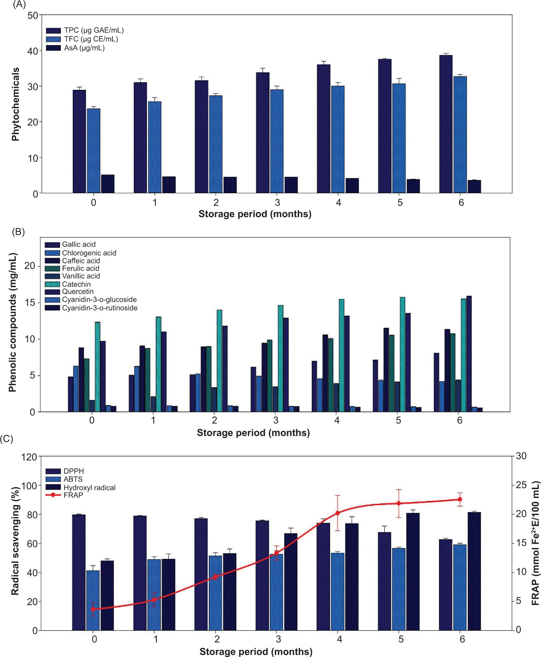 Phytochemicals of WACV are shown in Figure 3(A). Among the various phytochemicals in the WACV, the total phenolic content (TPC) was the most abundant, followed by total flavonoids (TFC) and AsA. Prolonged storage significantly affected the phytochemicals in the samples. TPC and TFC contents steadily increased in WACV during prolonged storage, whereas AsA steadily decreased. Various phenolic acids and flavonoids in WACV were quantified, and the results are presented in Figure 3(B). Phenolic acids such as gallic acid, chlorogenic acid, caffeic acid, ferulic acid, and vanillic acid were observed in WACV. Among the various phenolics, caffeic acid, ferulic acid, and gallic acid were the highest in WACV (P < 0.05). Chlorogenic acid tended to decrease throughout the storage period. Vanillic acid gradually increased in WACV until four months and was constant later. However, flavonoids such as catechin and quercetin concentrations highest among the various phenolic compounds. During storage, catechin and quercetin steadily increased in WACA, whereas the lesser components cyanidin-3-o-glucoside and cyanidin-3-o-rutinosidecontinuously decreased. Hornedo-Ortega et al. (2017) found that anthocyanin content in the vinegar was more susceptible than in the cider.