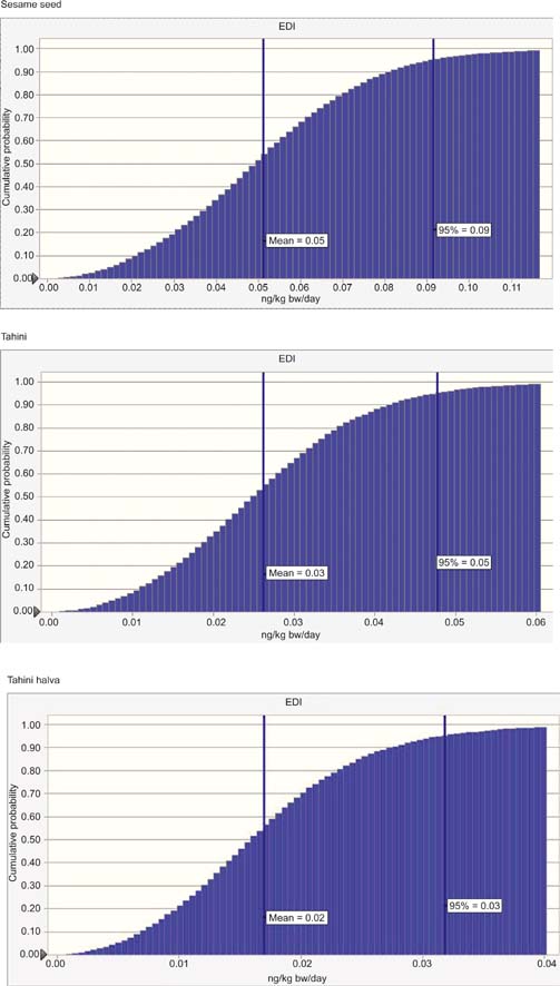 Findings of percentile 50 (as the median of the population) of EDI of AFB1 calculated using the MCS approach showed the lowest (0.02 ng/kg bw/day) and highest (0.05 ng/kg bw/day) of EDI in sesame seed and tahini halva, respectively (Figure 1). The percentile 95 of EDI of AFB1 through sesame seed, tahini, and tahini halva was 0.09, 0.05, and 0.03 ng/kg bw/day, respectively.