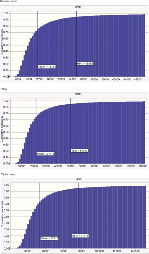 Figure 2. Cumulative probability plot of MOE of AFB1 through sesame seed, tahini, and tahini halva consumption.