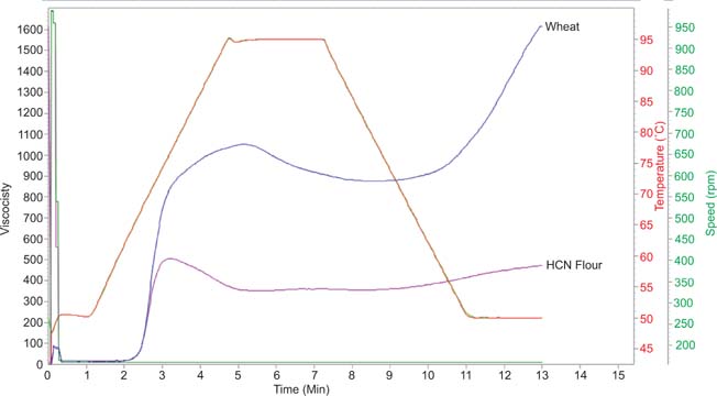 WAC describes the interaction of flour and water under a limited quantity of water. The WAC of flour plays a significant part in food research as it affects other determining properties of food material. HCN flour showed significantly lower values of WAC, 2.21 g/g as compared to wheat flour, 4.65 g/g (Table 2). Hydrophilic behavior and gel-forming ability of starch, and protein quality are the determining factors that affect the WAC of flour (Al-Farga et al., 2016). Higher number of hydrophilic components in flour is responsible for its elevated WAC (Njintang et al., 2008). The variation in the WAC behavior of the flours could be related to difference in the composition of the flour.