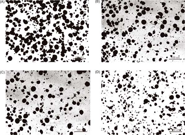 Figure 1. Micrographs of starch particles taken by light microscope: NS (A), HPH-NS (B), MS (C), HPH-MS (D). HPH: high pressure homogenization; NS: native starch; MS: modified starch.