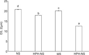 Figure 2. Particle size (D3,2) of the differently treated corn starch particles. Different letters on each bar indicate significant differences among the mean values (P < 0.05). NS: native starch; MS: modified starch; HPH: high pressure homogenization.