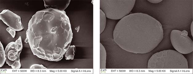 The emulsifying ability of starch granules as Pickering particles toward o/w emulsions is highly dependent on their composition, structure, and granule size (Timgren et al., 2013). In order to evaluate any likely effect of HPH on starch particles’ morphology and functionality, corn starch was preliminarily modified by using citric acid and then subjected to the homogenization process conditions used for emulsion preparation. It is known that HPH can significantly affect starch properties and induce gelatinization (Wang et al., 2008) ; however, in this work, pressure of homogenization was kept low (55 bar) to limit state transition of the starch particles dispersed in the aqueous phase.