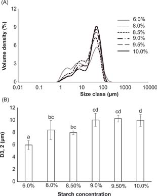 Figure 4. Droplet size distribution (A), and surface mean droplet size (B) of o/w Pickering emulsions prepared with different concentrations of modified corn starch. Different letters in the same columns indicate significant differences (P < 0.05) (n = 3).