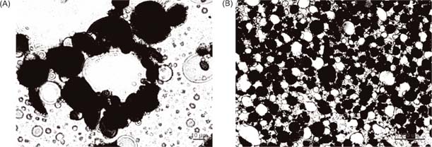 Figure 5. Optical microscope images of Pickering emulsions prepared with 9.5% MS at different magnifications (10× in A, 40× in B). MS granules appear to be black in color (MS: modified starch).