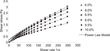 Figure 6. Flow behavior of the o/w Pickering emulsions prepared with different concentrations of modified corn starch (6.0–10.0% w/w).