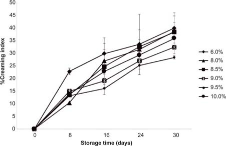 Figure 7. Effect of storage time on creaming index stability of o/w Pickering emulsions prepared with high dynamic pressure and modified corn starch at different concentrations (6.0–10.0%).