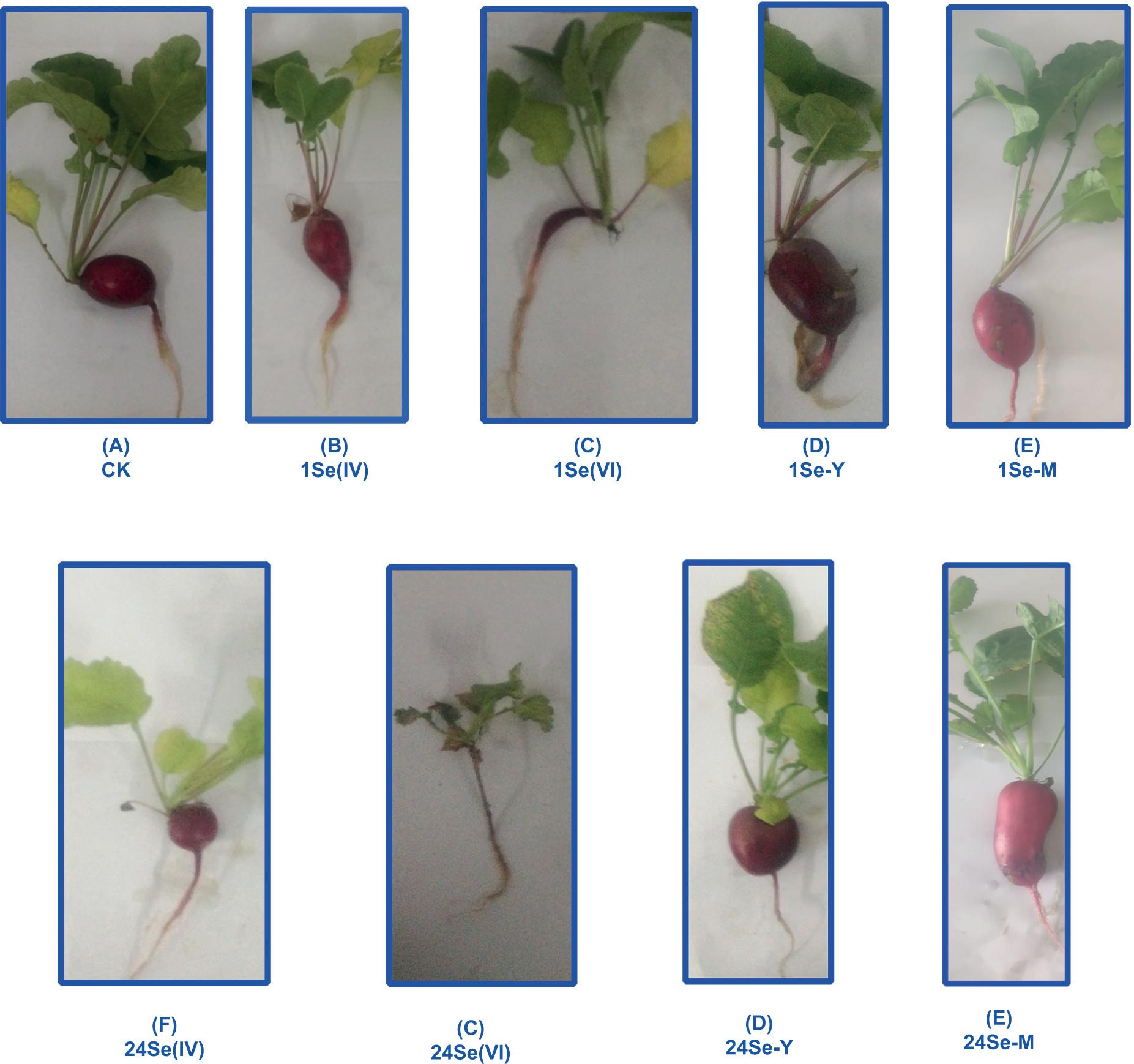 Figure 1 shows the growth of radish in the control group, low Se treatment level (1Se) and high Se treatment level (24Se). It was observed that the growth of radish with organic Se source was better than that of inorganic Se source. In the Se(VI) treatment group, the growth of radish was significantly inhibited and root development was limited. It suggested that the organic Se (including Se-Y and Se-M) could significantly promote the growth of radish whereas the expected growth of radish was severely inhibited with the gradual increase of Se application in Se(VI) treatments. The present study suggests that the application of organic Se fertilizer was more beneficial for growth of plants than the application of inorganic Se fertilizer, which was consistent with previous reports (Surai and Dvorska, 2001; Wang and Lovell, 1997). Organic Se could effectively increase the content of organic matter and bioaccessible Se in the soil and improve the content of phosphorus and potassium to increase soil fertility and enhance the absorption and utilization of crop nutrients (Li et al., 2017). Studies have demonstrated that using organic Se fertilizer could significantly improve the growth and nutritional quality of grapes, increase the Se content and reduce the accumulation of heavy metals (Zhu et al., 2017).