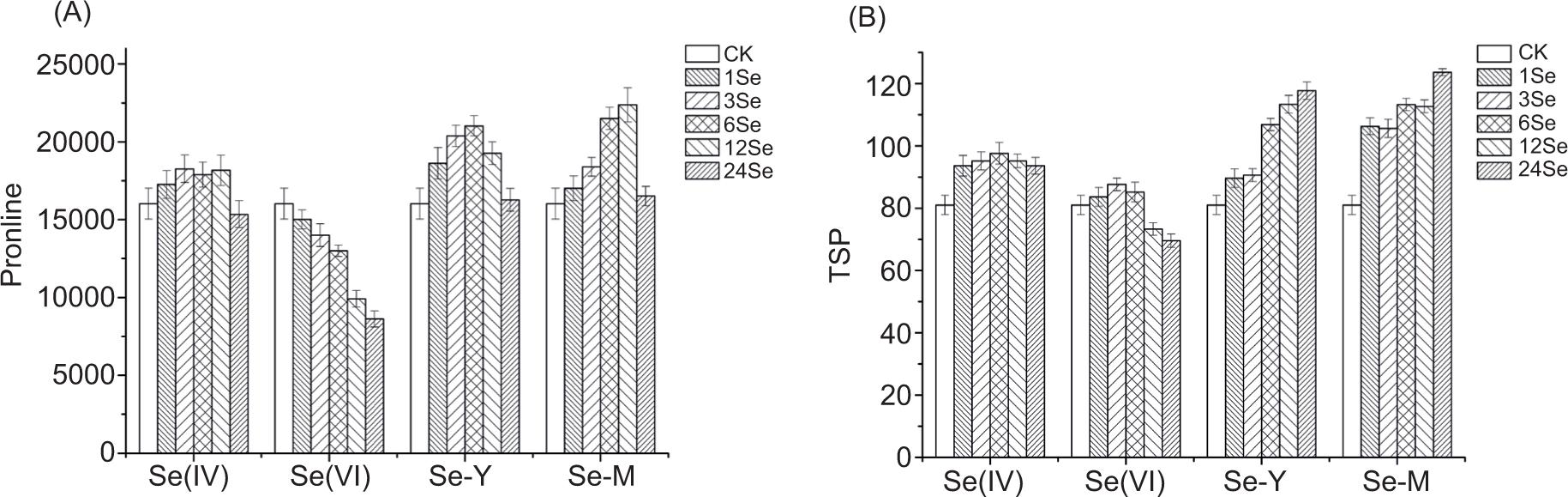 Figure 4. (A) The proline content in radish with application of different Se sources: sodium selenite (Se(IV)), sodium selenate (Se(VI)), selenium yeast (Se-Y) and selenium malt (Se-M) (μg g–1 FW). (B) The soluble protein content in radish with application of different Se sources: sodium selenite (Se(IV)), sodium selenate (Se(VI)), selenium yeast (Se-Y) and selenium malt (Se-M) (mg g–1 FW).
