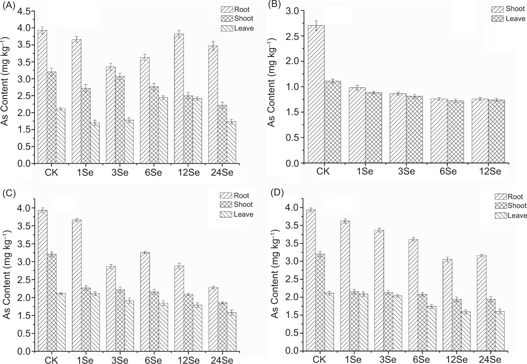 Figure 5. Arsenic concentration in radish roots, shoots and leaves with application of different Se sources: (A) sodium selenite (Se(IV)), (B) sodium selenate (Se(VI)), (C) selenium yeast (Se-Y) and (D) selenium malt (Se-M).