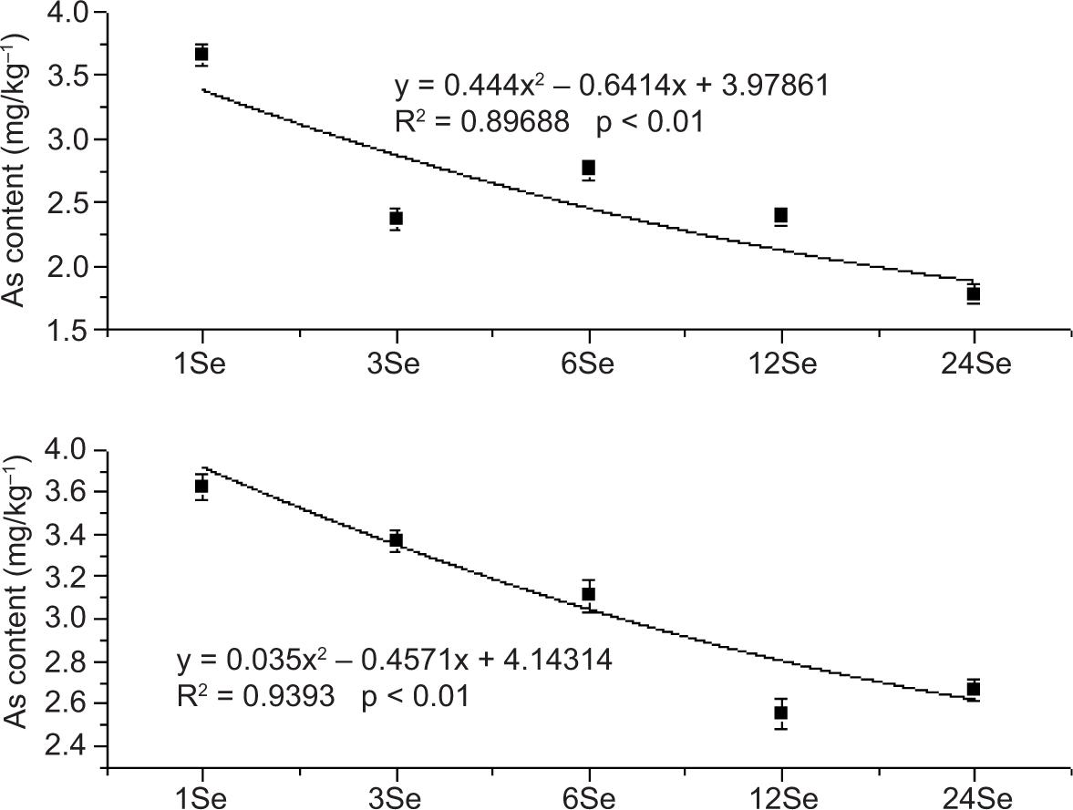 Pandey and Gupta (2018) reported that Se supplementation could significantly reduce the content of H2O2, NO and ROS in rice. Se supplementation alleviated the toxicity of As and restored the nutritional deficiency of rice induced by As. Besides, Se treatment increased the activity of thiol metabolism-related enzymes. Yeh et al. (2003) reported that the mechanism of Se alleviating the toxicity of As was because Se could regulate glutathione peroxidase (GPX) activity. Malik et al. (2012) reported that Se could effectively inhibit the As absorption of mung bean plants, enhance their antioxidant and anti-stress properties, and alleviate the toxic effects of As on the stated plants. Plants treated with Se were also less affected by As-induced cell membrane, chlorophyll and cell viability.