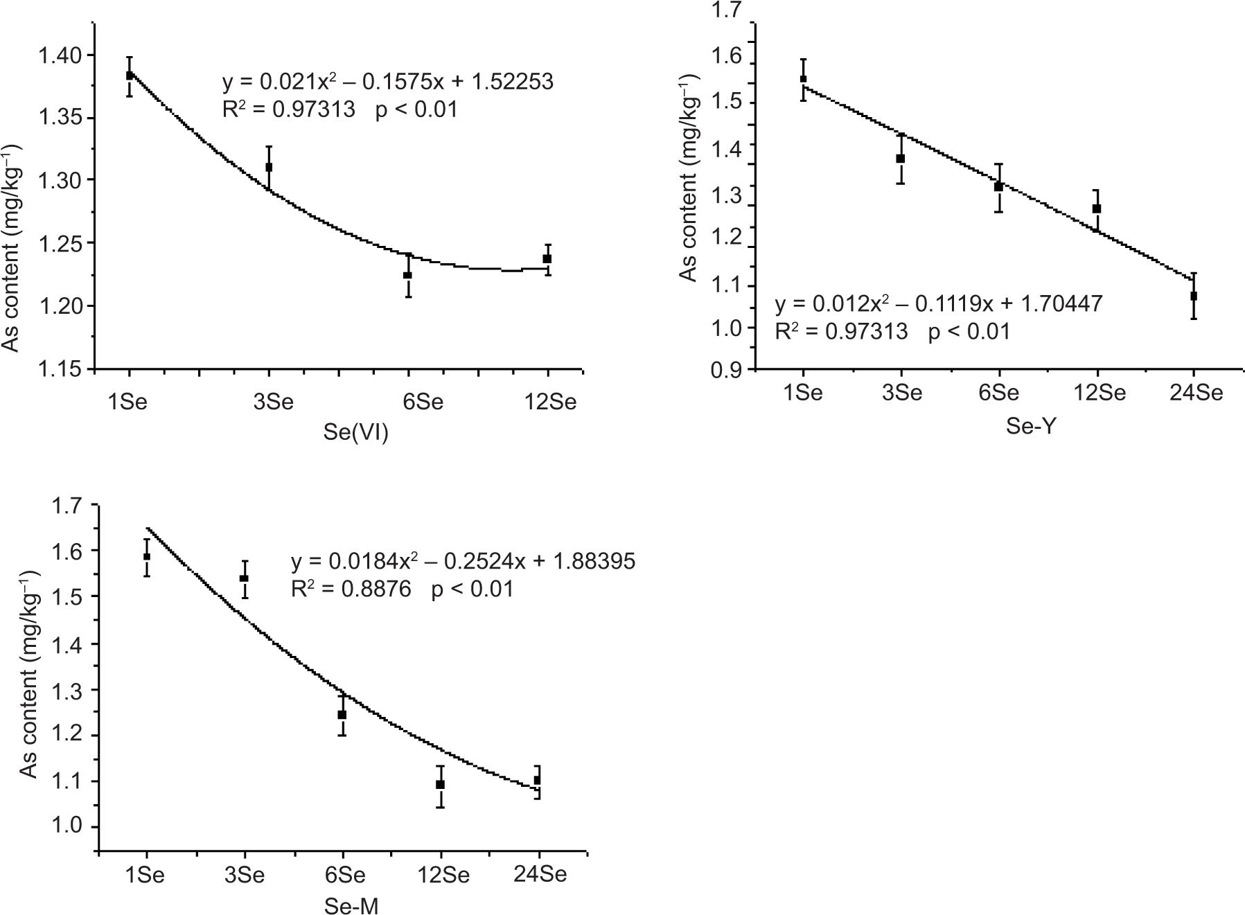 Figure S2. Relationship between arsenic content in radish roots and the adding amount of exogenous selenium of sodium selenite (Se(IV)), sodium selenate (Se(VI)), selenium yeast (Se-Y) and selenium malt (Se-M).