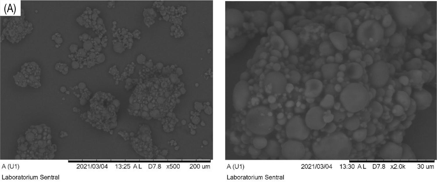 Samples C and F, which were vacuum-dried VCO powders, had an angular and nonuniform morphology with large cavities on their surfaces. Similar result was observed by Mutlu et al. (2020). The presence of cavities in the particles was caused by the suction/vacuum process of water vapor from the heated material to produce dry products with large hollows (Reis, 2014). This particle morphology was almost the same as that of freeze-dried particles but not porous and also had a high surface oil, so it was very oily resulting in low wettability and solubility, making it unsuitable for instant powder drinks.