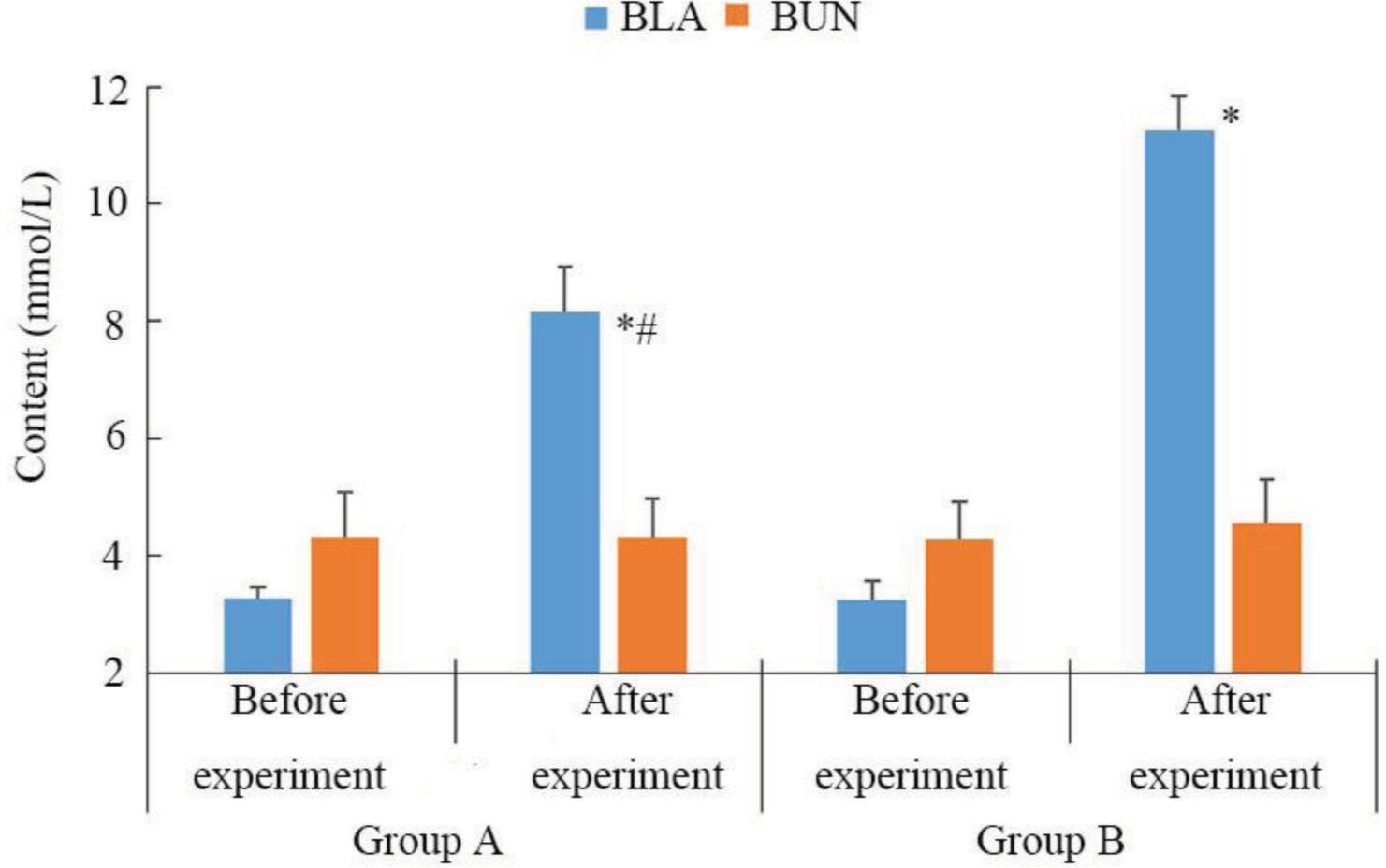 As shown in Figure 2, before the experiment, the BLA values of the two groups were 3.27 ± 0.21 mmol/L and 3.26 ± 0.33 mmol/L, respectively, suggesting no significant difference; after the experiment, the BLA of group A increased to 8.16 ± 0.78 mmol/L, while that of group B increased to 11.27 ± 0.56 mmol/L, which were significantly different from those before the experiment, and the BLA value of group A was significantly smaller than that of group B (P < 0.05); before the experiment, the BUN value of two groups were 4.31 ± 0.78 mmol/L and 4.29 ± 0.64 mmol/L, respectively; after the experiment, the BLA values of the two groups were 4.33 ± 0.64 mmol/L and 4.56 ± 0.74 mmol/L, respectively, which showed a slight increase, but the difference was not obvious. It was found that drinking Siraitia grosvenorii water could inhibit the growth of BLA.