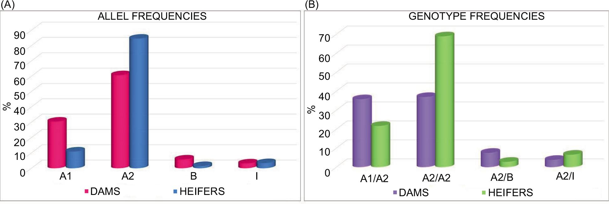 Figure 1. Graphics of the allele (A) and genotype (B) frequencies variation (%) in the examined dams and heifers after MAS selection.