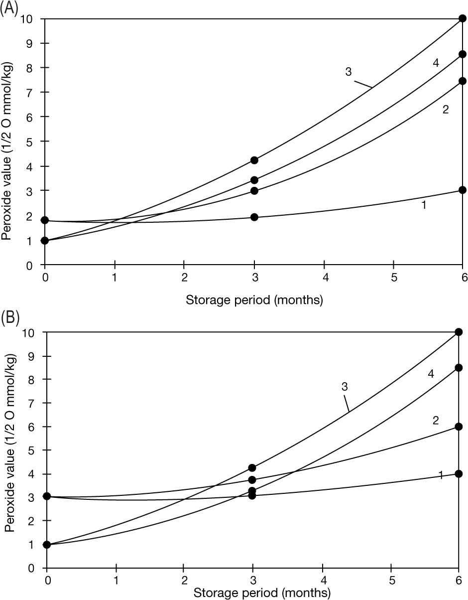 Figure 1. Peroxide values of (A) blend No. 1, and (B) blend No. 2. Note: Curves 3 and 4 reflect the values obtained for the control sample. Curves 1 and 2 correspond to the experimental blends stored at 10°C and 20°C, respectively.