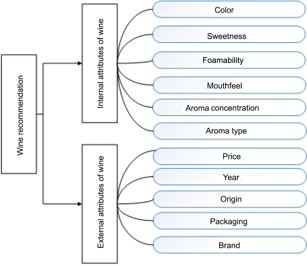According to the sensory system of Chinese wine and the research literature of wine field, this study used the inherent wine attributes as recommended index, including colour, sweetness, foamability, mouthfeel, price, concentration and type of aroma, year, origin, packaging and brand of wine. The data types were all discrete. For the convenience of subsequent calculation, the dependent variables were coded by natural numbers according to the specific labels in the recommended index. The inherent attributes of wine applied in this study can be concluded in Figure 1.
