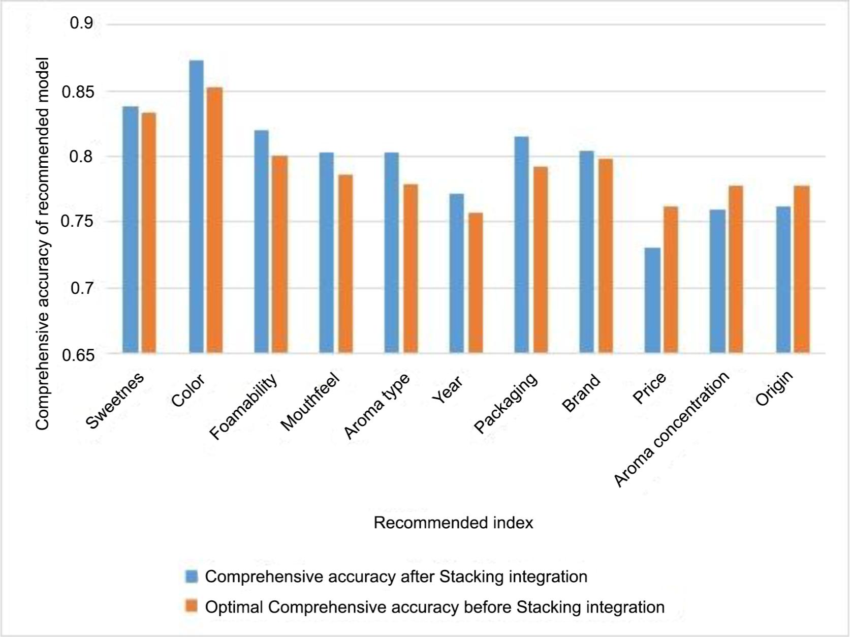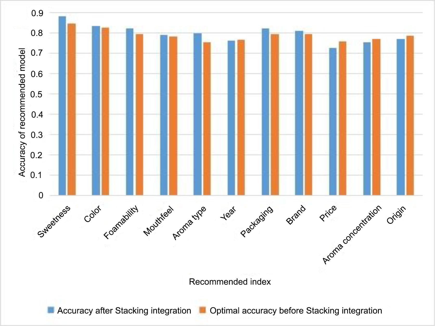 To effectively reduce or offset the influence of random factors and improve the prediction accuracy and credibility in a single model, the Stacking integration was introduced into wine recommendation. The results showed that the integration algorithm could be used to improve the recommendation accuracy of eight indicators, including colour, sweetness, foamability, mouthfeel, aroma type, year, packaging and brand. The average recommendation accuracy is increased by 1.9%, and the highest is increased by 3%. However, it is not suitable for the attributes with large deviation such as aroma concentration. For this kind of tasks, Adaboost and other algorithms are more suitable for recommendation.
