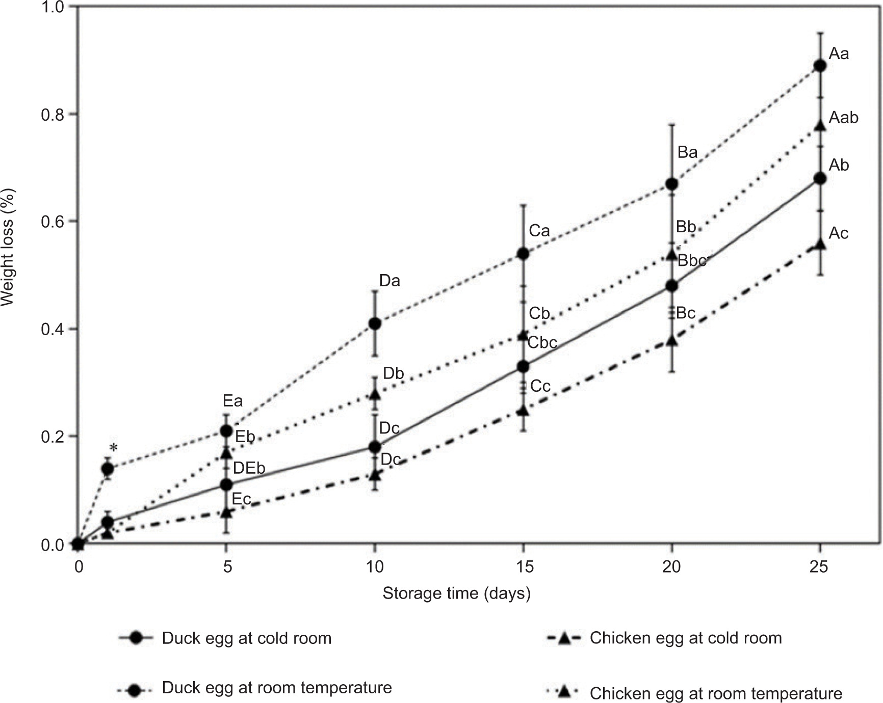 Figure 1. Weight loss of duck eggs and chicken eggs at different storage days and temperatures; different uppercase letters indicate significant differences between treatments (p<0.05); different lowercase letters indicate significant differences between treatments (p<0.05); * mean significant differences of duck egg at cold room temperature (DC), chicken egg at cold room temperature (CC), duck egg at room temperature (DR), and chicken egg at room temperature (CR) at day 0 (Fa, Ea, Fa, and Fa) and day 1 (EFb, Eb, Ea, and Fb), respectively.
