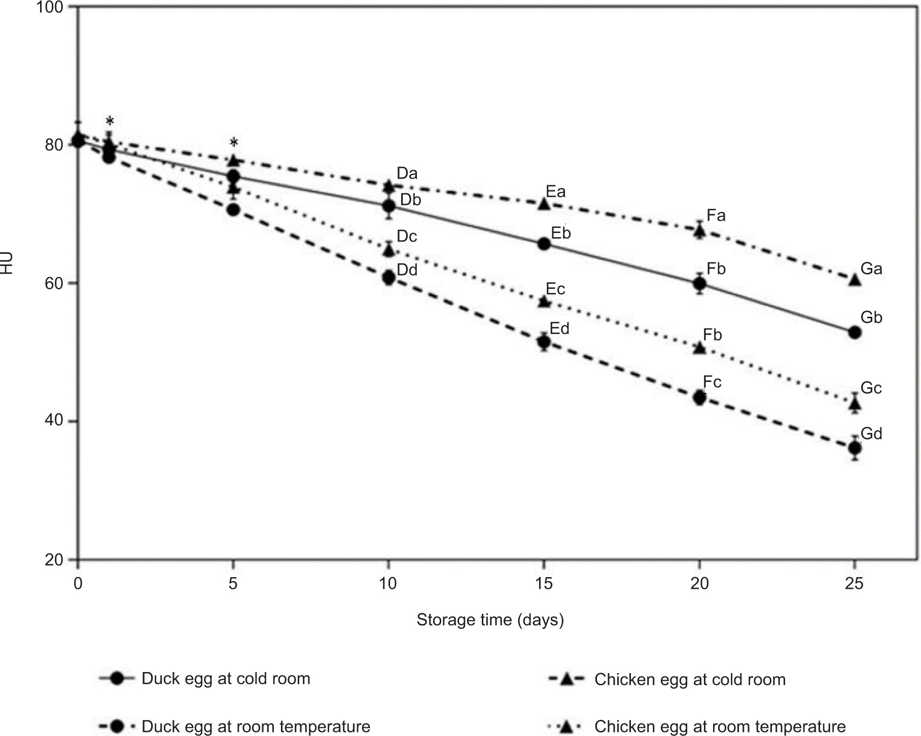 Newly laid eggs had thick and thin zones of egg white after cracking. The Haugh Unit (H.U.) is used to measure the freshness of a bird egg (Akter et al., 2014). The higher the H.U., the fresher the egg. At longer storage time the egg white became flatter and thinner. Statistical analysis indicated that the H.U. value mainly depended on storage temperature and time. Results revealed that duck eggs lost their freshness faster than chicken eggs, in line with higher weight loss due to higher eggshell porosity. The H.U. value decreased as storage time increased, as shown in Figure 2, with carbonic acid converting to form CO2. Higher CO2 loss gave reduced egg white height, with decreased viscosity and thickness (Kocetkovs et al., 2022). Lysozyme is an antibacterial enzyme that functions with ovomucin to make the egg white viscous (Mine and Zhang, 2013; Wang et al., 2019). The lysozyme enzyme is activated at a pH value of around 8 and proteolysis occurs which also facilitates CO2 loss (The Poultry Site, 2014), while increased water in the system leads to reduced viscosity. The egg yolk absorbs water from the egg white and its size increases. Enlargement and weakness of the vitelline membrane occur, giving a flat yolk (The Poultry Site, 2014). The Thai Agricultural Commodity and Food Standards (2010a;b) grades eggs following the USDA into three groups based on freshness. H.U. ≥ 72 is AA, 60–71 is A, and < 60 is B. Results showed that duck eggs were AA during the first 10 d and 5 d when kept in the cold room (4±2oC) and at room temperature (28±2oC), respectively while chicken eggs were AA during the first 15 d and 5 d stored in the cold room (4±2oC) and at room temperature (28±2oC), respectively.