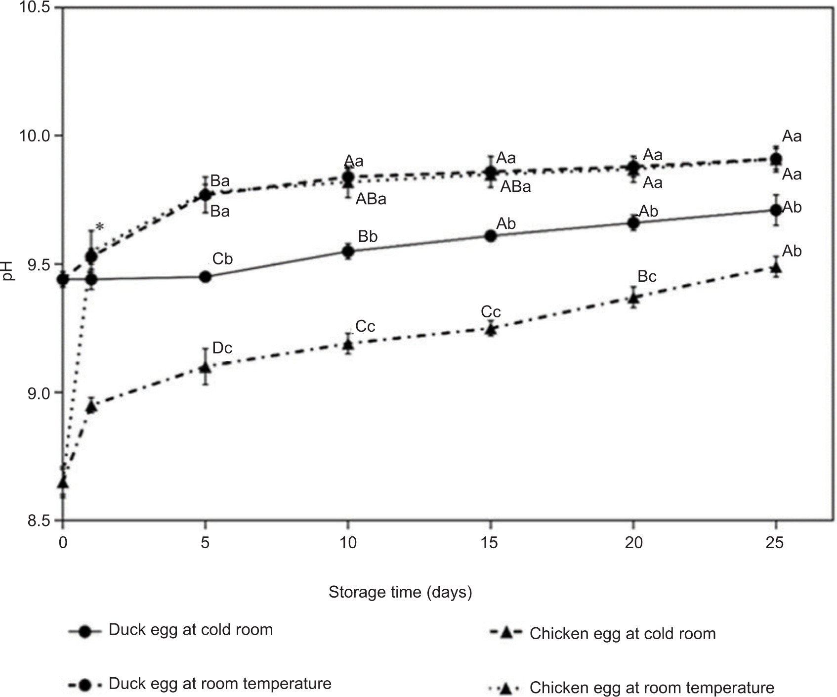 Figure 3. pH of egg white from duck eggs and chicken eggs at different storage days and temperatures; different uppercase letters indicate significant differences between treatments (p<0.05); different lowercase letters indicate significant differences between treatments (p<0.05); * mean significant differences of duck egg at cold room temperature (DC), chicken egg at cold room temperature (CC), duck egg at room temperature (DR), and chicken egg at room temperature (CR) at day 0 (Ca, Fb, Da, and Db) and day 1 (Cb, Ec, Cab, and Ca), respectively.