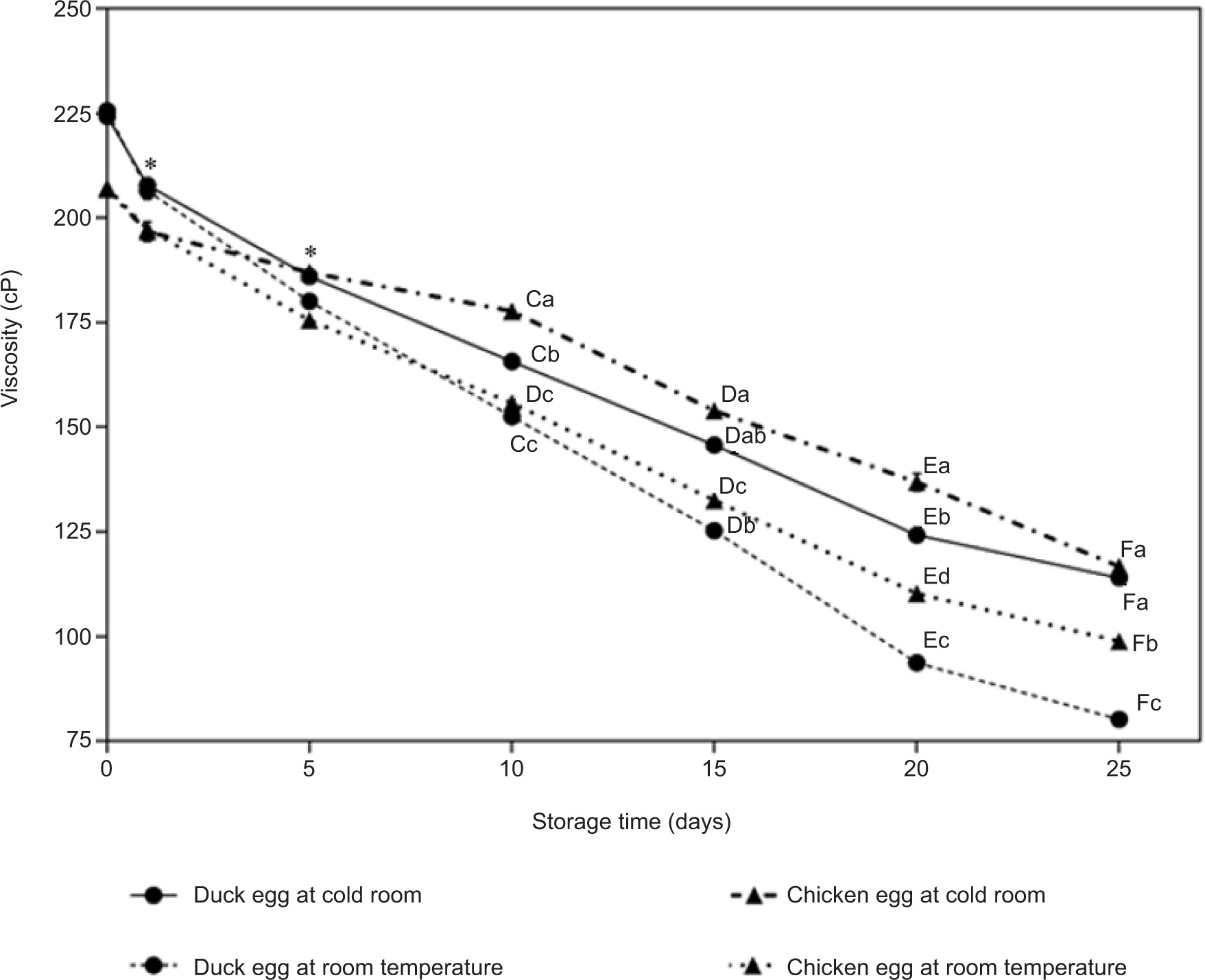 Figure 4. The viscosity of egg white from duck eggs and chicken eggs at different storage days and temperatures; different uppercase letters indicate significant differences between treatments (p<0.05); different lowercase letters indicate significant differences between treatments (p<0.05); * mean significant differences of duck egg at cold room temperature (DC), chicken egg at cold room temperature (CC), duck egg at room temperature (DR), and chicken egg at room temperature (CR) at day 0 (Aa, Ab, Aa, and Ab), day 1 (Aa, Bb, Aa, and Bb), and day 5 (Ba, BCa, Ba, and Ca), respectively.