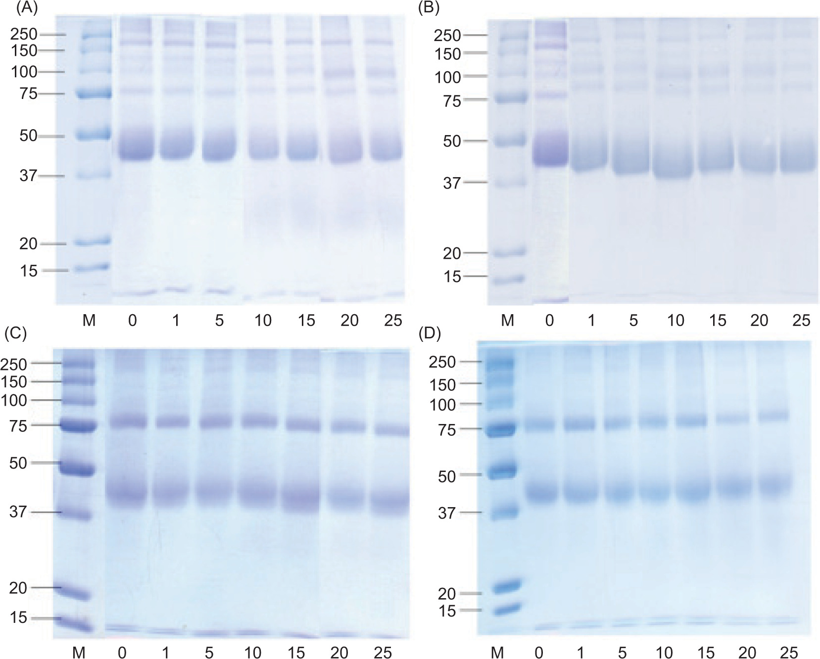 Figure 5. SDS-PAGE pattern of egg white protein from duck eggs and chicken eggs at different storage days and temperatures. Duck egg white stored at cold room temperature (4±2oC) (A) and room temperature (28±2oC) (B), and chicken egg white stored at cold room temperature (4±2oC) (C) and room temperature (28±2oC) (D) on 4–12% Bis-Tris gel stained with Coomassie brilliant blue. Lane 1–7: egg white protein at 0, 1, 5, 10, 15, 20, and 25 d; M: molecular weight standard.