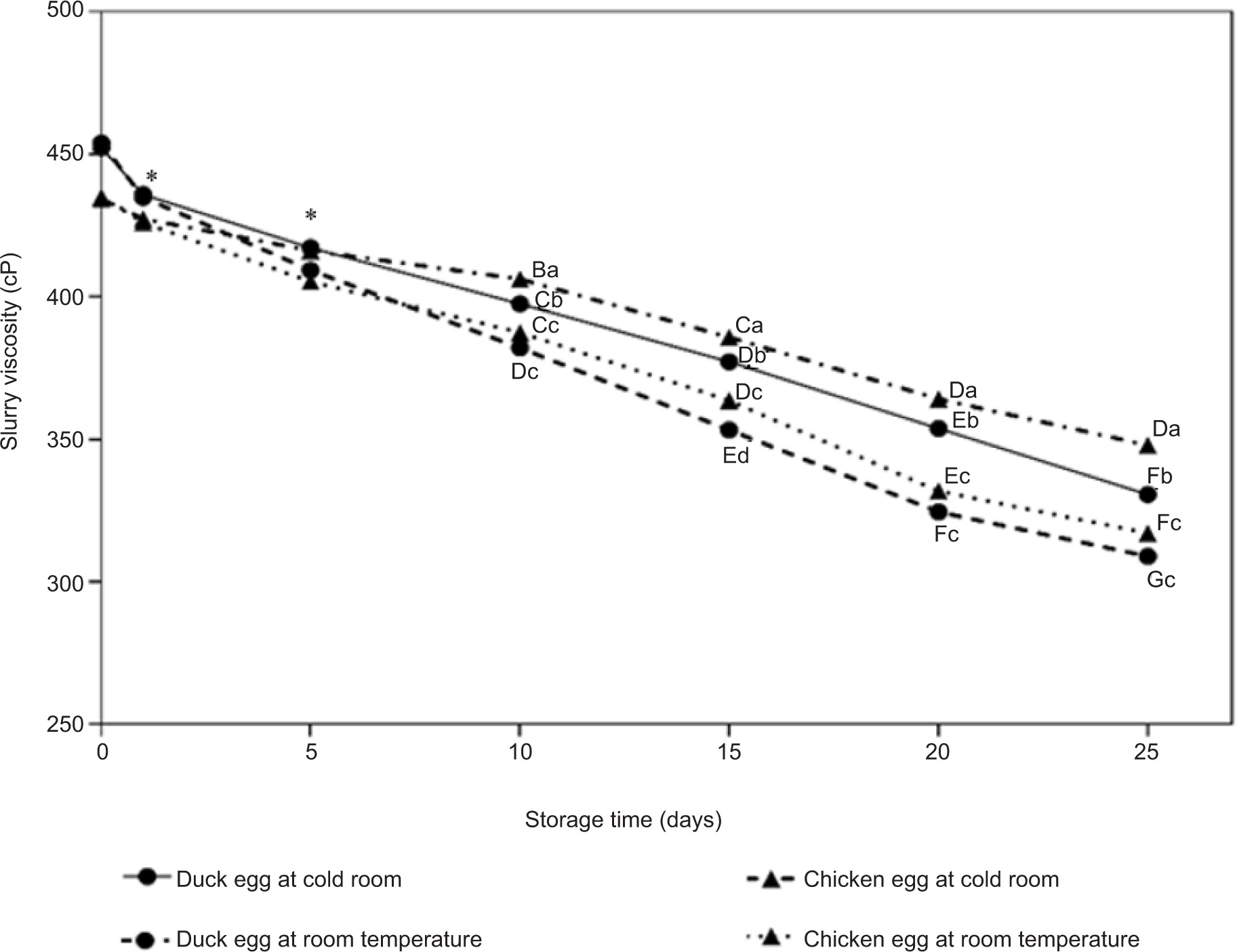 The slurry viscosity of each egg type and storage condition is shown in Figure 6, with a decrease as storage time increases (p<0.05). This result is related to the viscosity of egg whites. At day 0, the slurry from duck egg whites had a higher viscosity than chicken egg whites because duck egg whites contained ovomucin with two molecular weight ranges (110 and 220 kDa), while chicken egg whites contained only 110 kDa (Alleoni, 2006; Mine and Zhang, 2013). Slurry viscosity in both duck and chicken egg whites decreased along with aging.