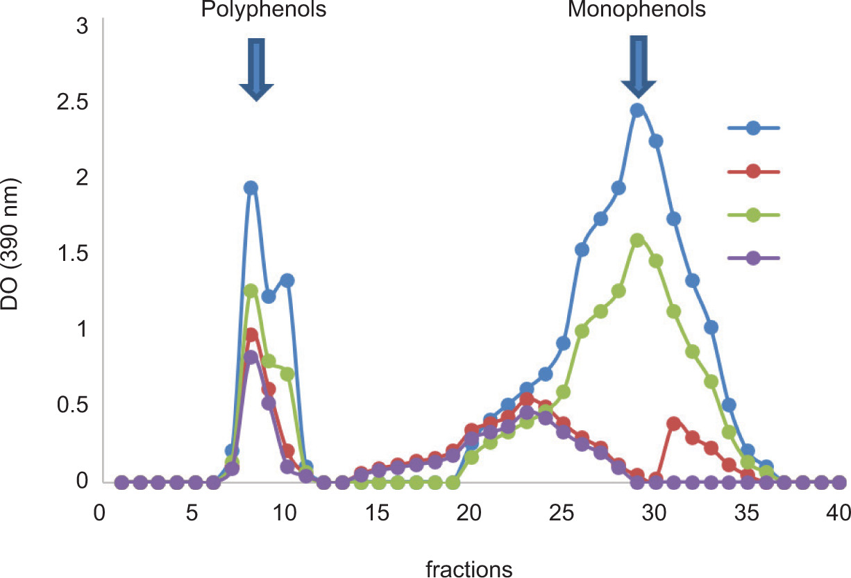 Sephadex G50 gel exclusion chromatography allowed simple and rapid separation of phenolic compounds from plants. The chromatographic results obtained after spectrophotometric analysis of the two studied varieties of M. oleifera (Mssisi and Lamta) are illustrated in Figure 2.
