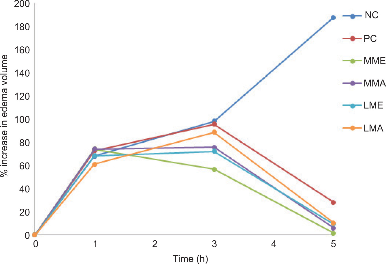 Figure 3. Percentage increase (average ± standard deviation) in the plantar paw of mice after carrageenan injection. NC: negative control; PC: positive control; MME: phenolic compounds extracted by ethanol from Moringa planted at Mssisi; MMA: phenolic compounds extracted by distilled water from Moringa planted at Mssisi; LME: phenolic compounds extracted by ethanol from Moringa planted at Lamta; LMA: phenolic compounds extracted by distilled water from Moringa planted at Lamta.