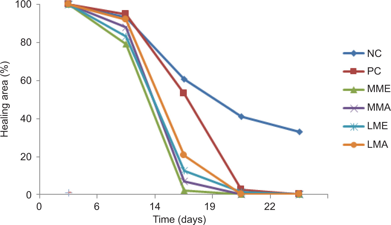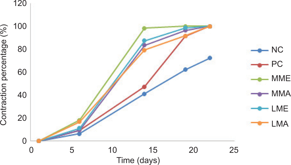 Figure 5. Evolution of the average proportion of burn contraction (average ± standard deviation) in controls and treated groups. NC: negative control; PC: positive control; MME: phenolic compounds extracted by ethanol from Moringa planted at Mssisi; MMA: phenolic compounds extracted by distilled water from Moringa planted at Mssisi; LME: phenolic compounds extracted by ethanol from Moringa planted at Lamta; LMA: phenolic compounds extracted by distilled water from Moringa planted at Lamta.