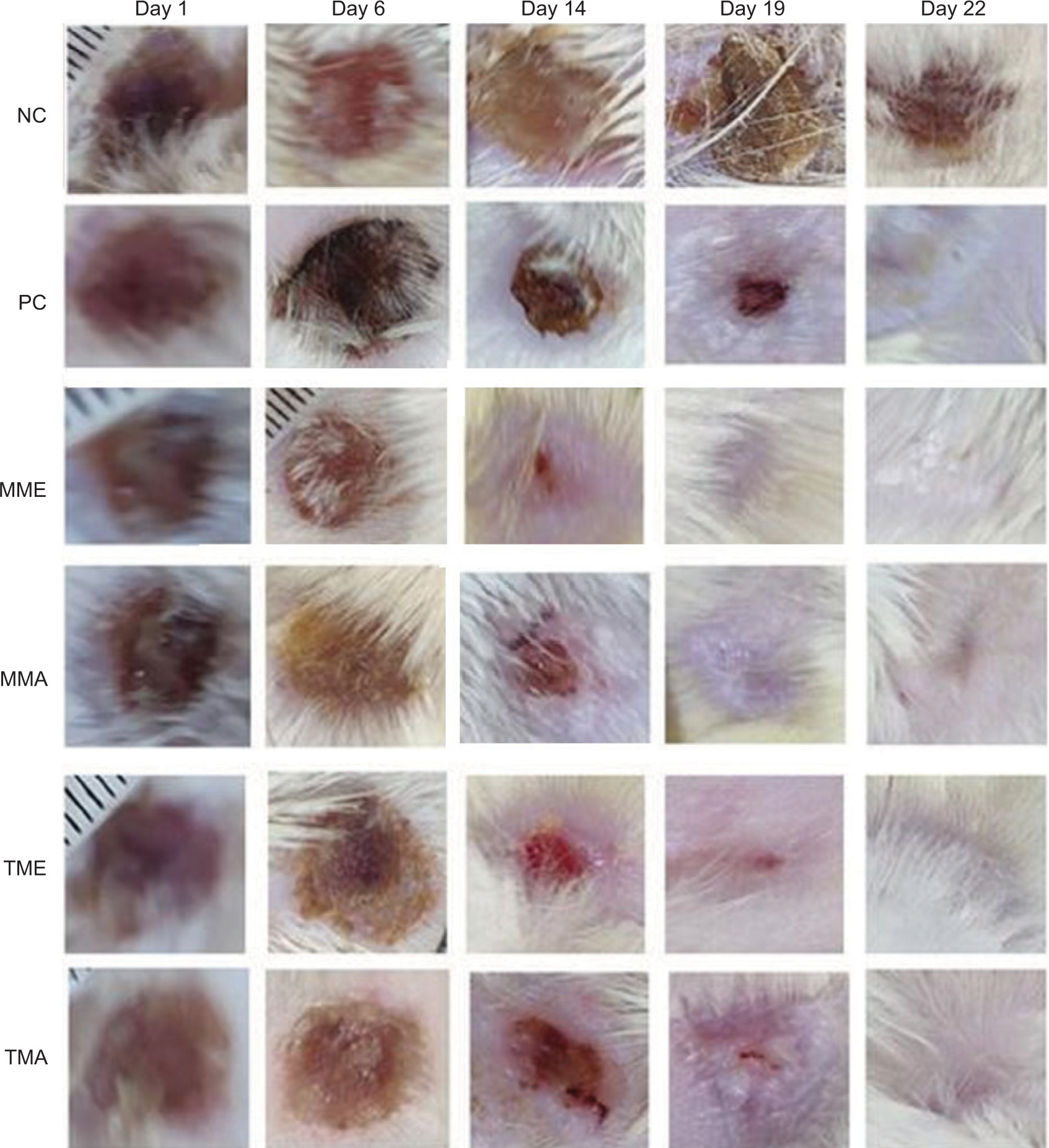 The burned mice were treated with the formulated ointment once daily corresponding to their respective group, while mice in the negative control group received no treatment. Although wounds created remained uncovered, photographs were taken daily to track the healing process.
