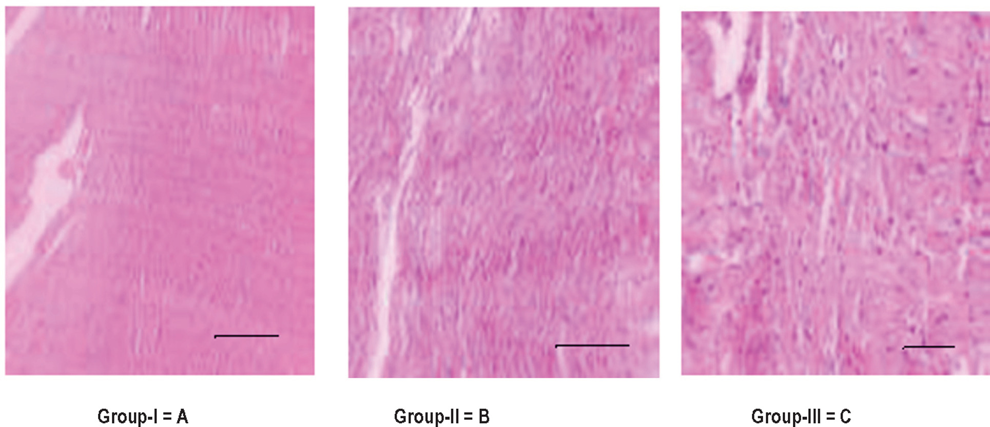 Figure 1. Effect of oxidized lipid on the heart tissues of albino mice. Group A: control; group B: congested myocardial -condition with fresh coconut oil feed; group C: papillary muscles and few vacuolizations with thermally oxidized coconut oil feed.