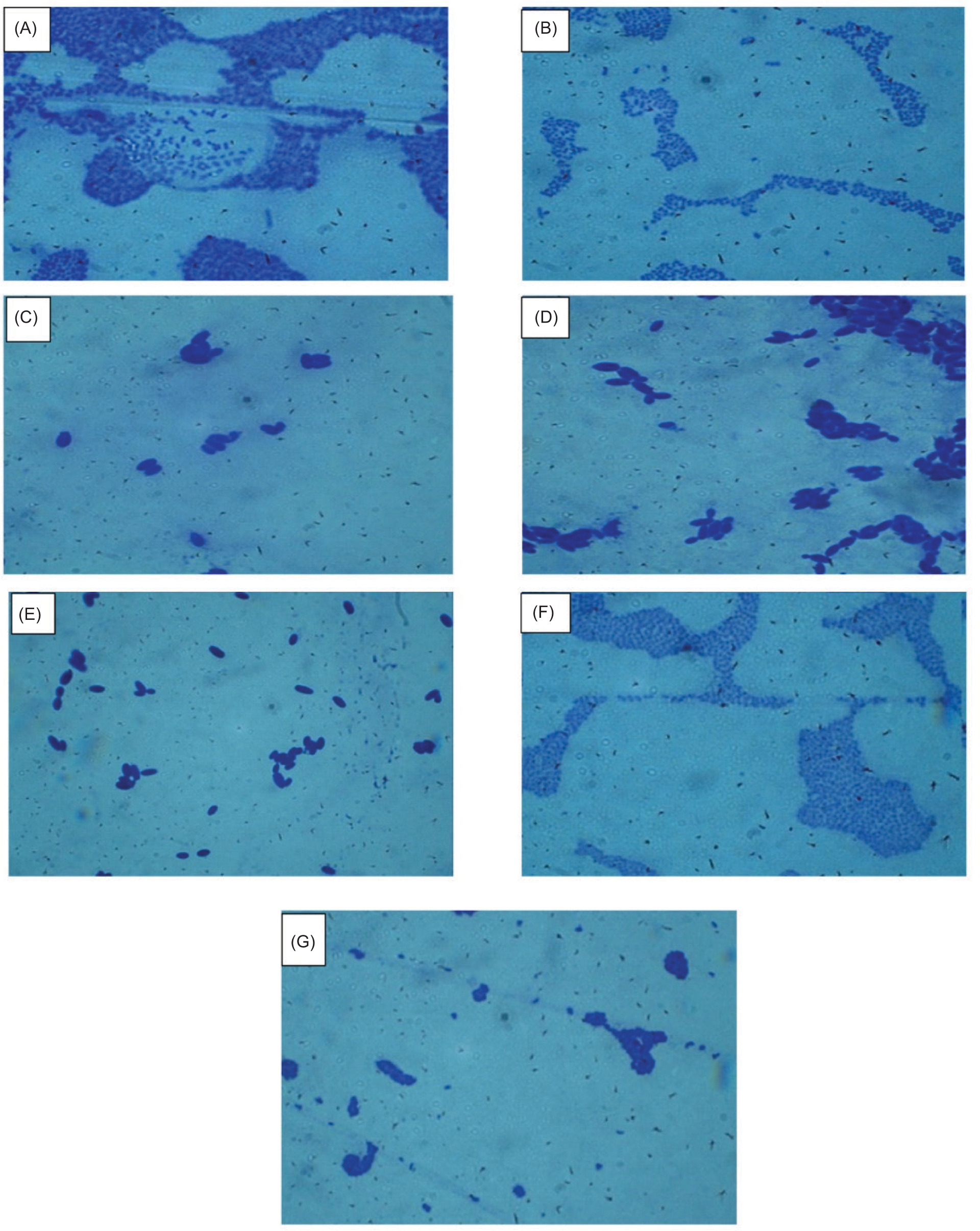 Figure 1. Cellular characteristics showing gram-positive reaction (A–G) and shapes as Diplococci CG1, CG2, CA4, CB1 (A, B, F, G), rods CGr1, CGr2, CA2 (C–F).
