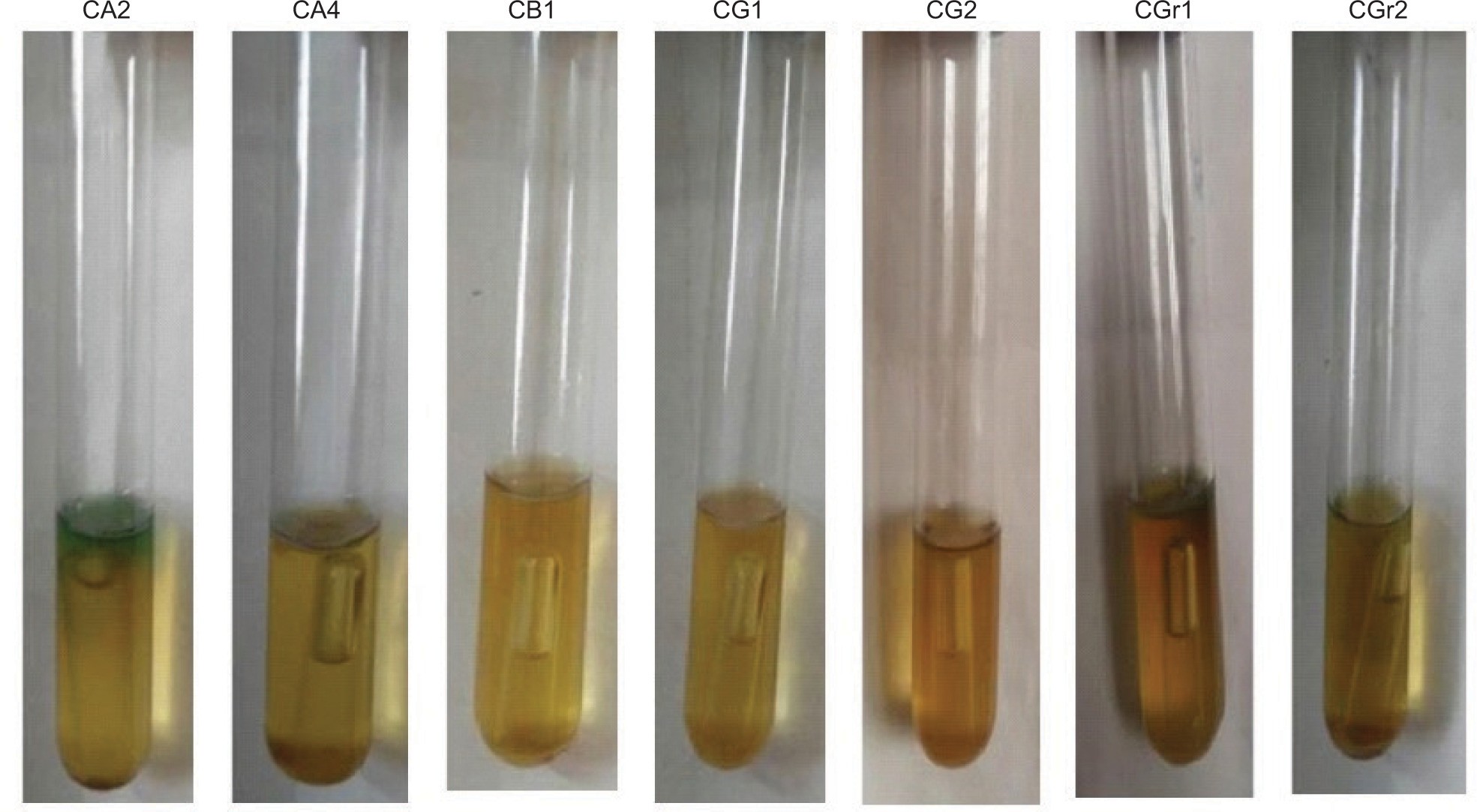 Figure 2. Gas production observed in Durham tubes by CA2, CA4, CB1, CG1, CG2, CGr1 and CGr2.