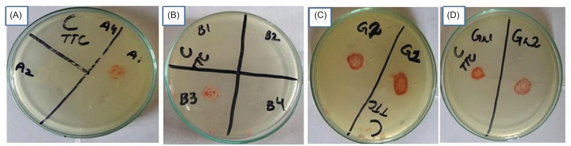 Figure 3. Cellulose degradation evaluated by development of maroon color on TTC by CA2 (A), CB1 (B), CG1, CG2 (C) and CGr1, CGr2 (D).